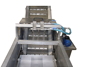 同時,滿箱的物料箱被自動輸送到輥筒輸送線上,由操作人員處理。浸水輸送裝置可使膠料冷卻并防止膠料碎屑相互污染。水箱內(nèi)有余料箱,方便取出清理。當(dāng)冷卻輸送機上無膠料時,空運行5分鐘后,即自動停機。
